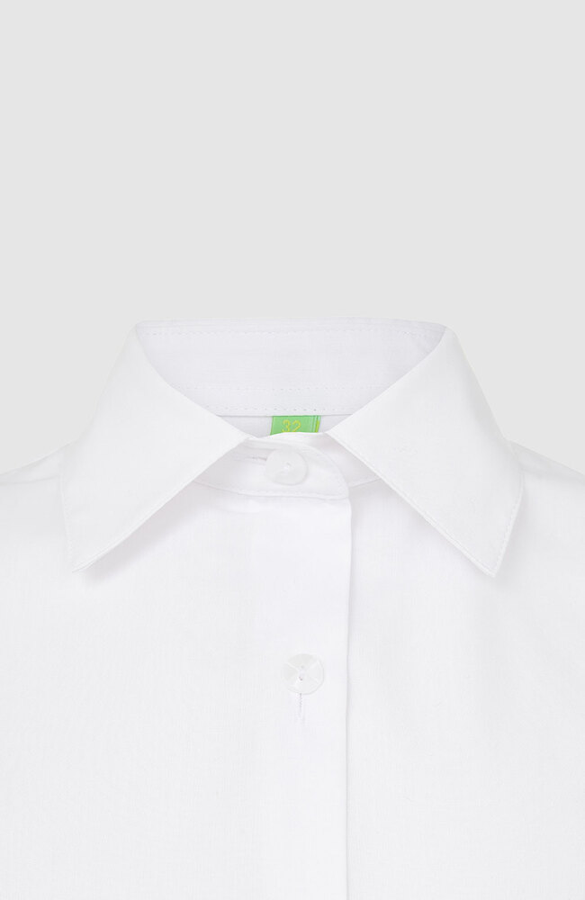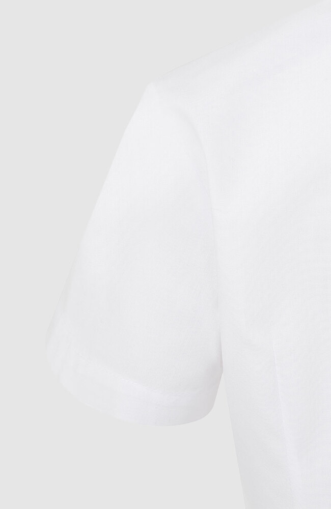 Блузка полуприлегающего силуэта с короткими рукавами и фигурной формой низа. На спинке вытачки.