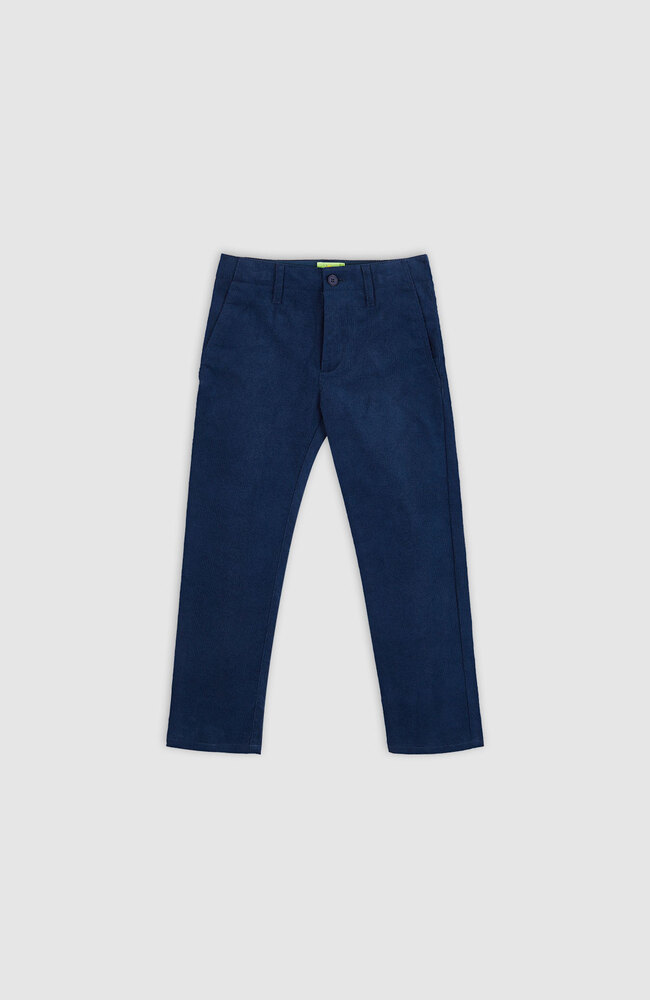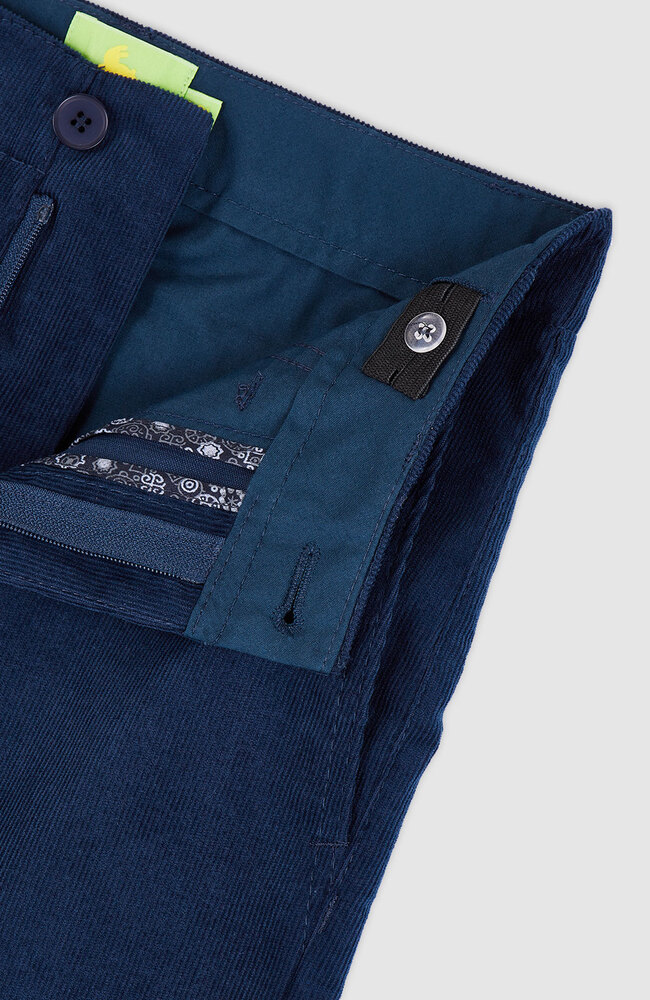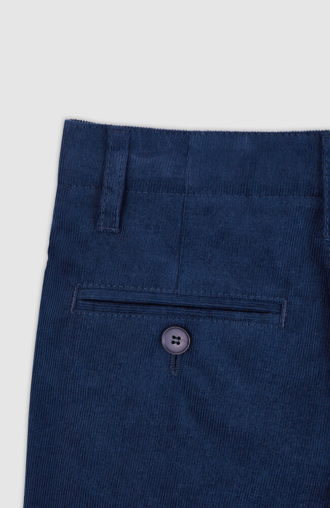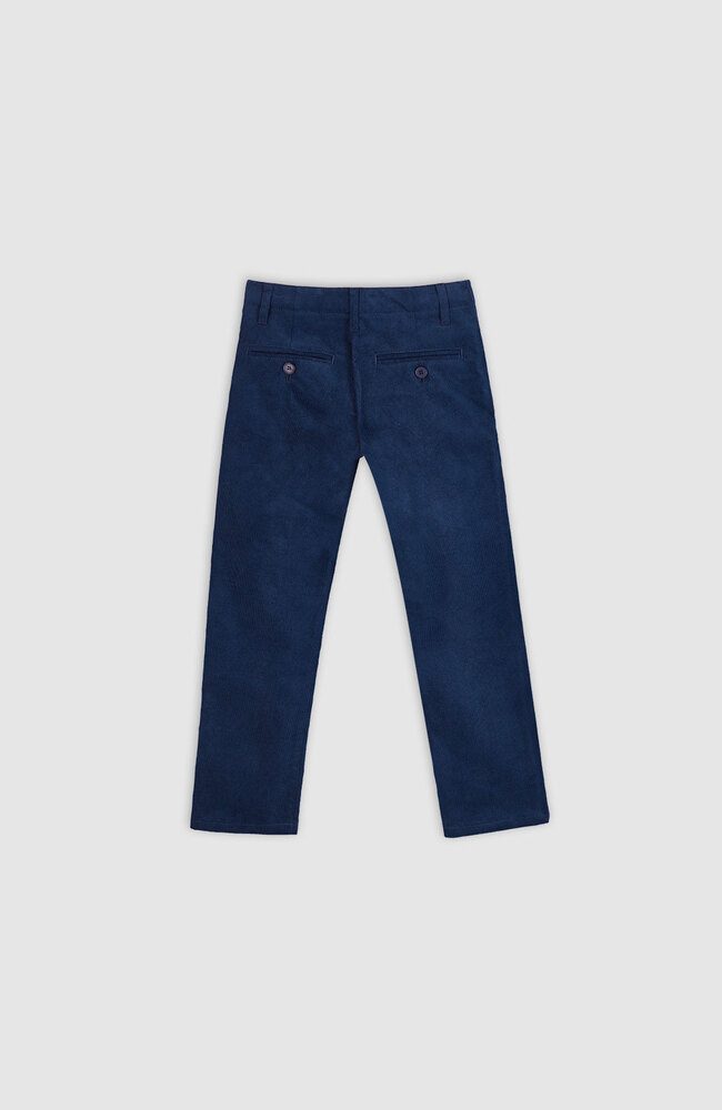 Зауженные хлопковые брюки из вельвета. Застегиваются на пуговицу и тесьму «молния». Пояс регулируется эластичными деталями и пуговицами с внутренней стороны. Брюки имеют два боковых кармана и два задних кармана с застежкой на пуговицу. Без подкладки.