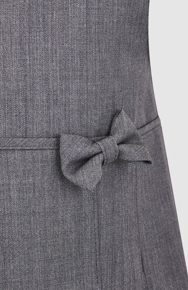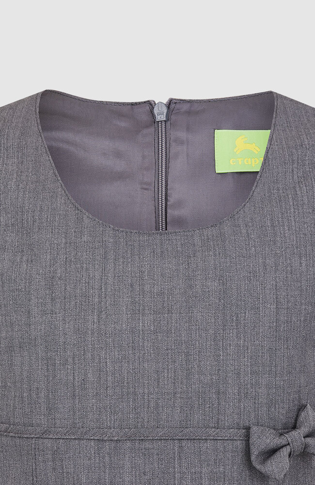 Сарафан со складками, декорирован кантом и бантиком. В рельефных швах расположены карманы. Застежка в среднем шве спинки на потайную тесьму «молния». Сарафан на подкладке.