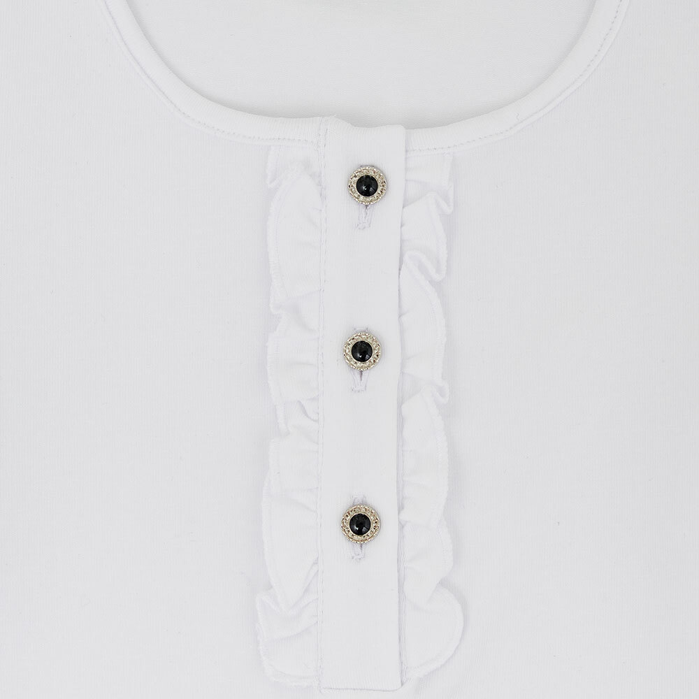 Трикотажная блузка с длинными рукавами и рюшами . Застежка на три пуговицы.
